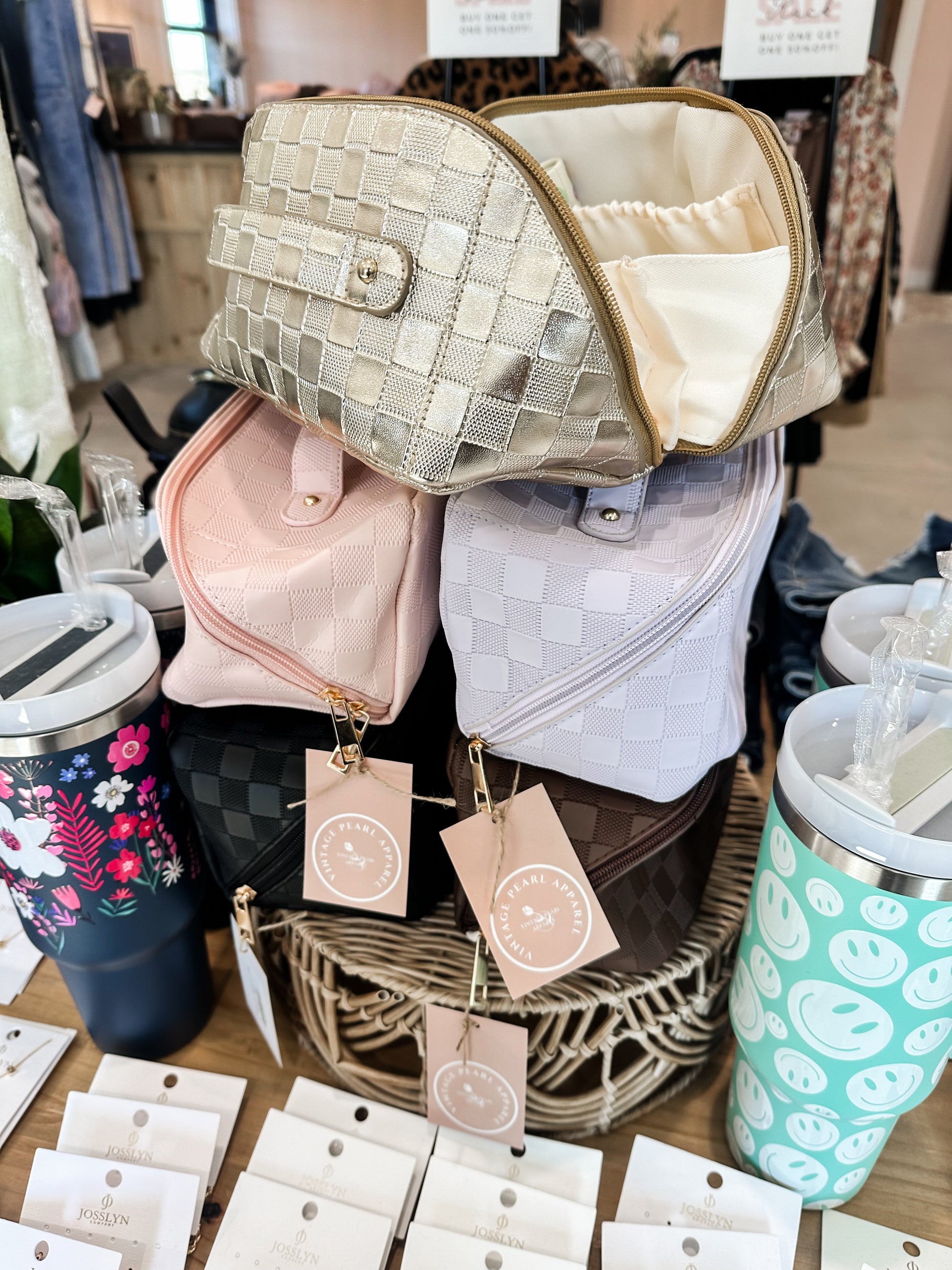 This expandable makeup bag is going to be your new best friend! Sleek design zips up all your makeup without being super bulky! Interior features one zip pocket & 2 slide in pockets. Exterior features easy carry handle!