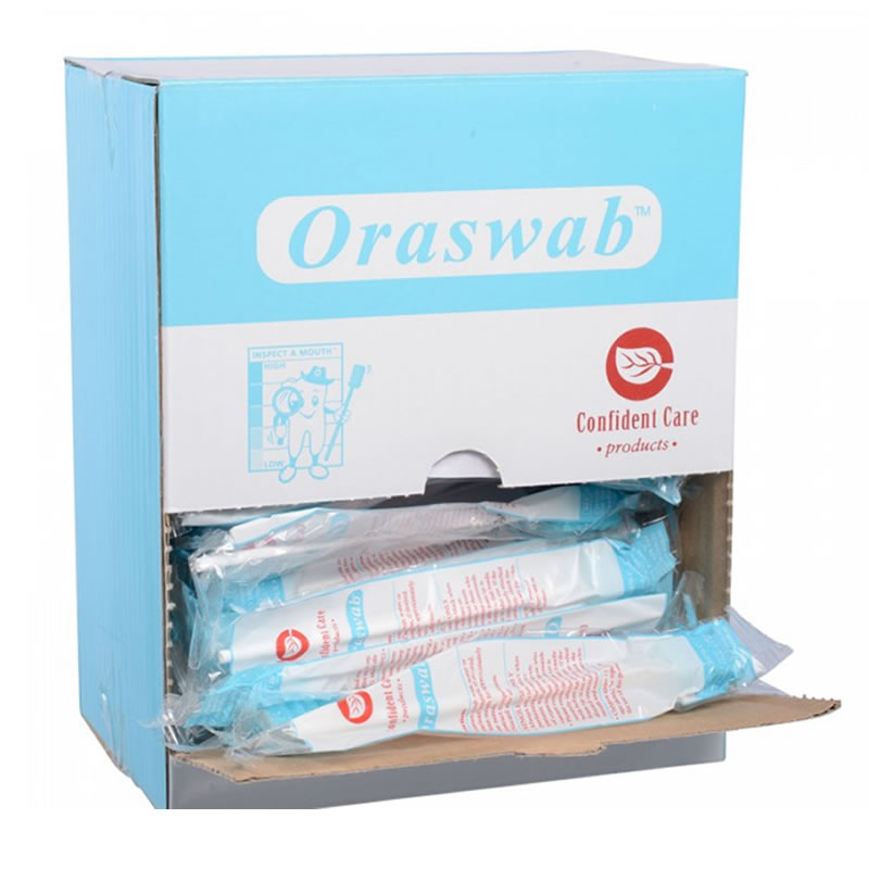 Oraswab consist of an attached soft foam head that aids to gently lift and remove plaque debris and mucus from the oral cavity. They may also stimulate oral tissue and help clean between the teeth.