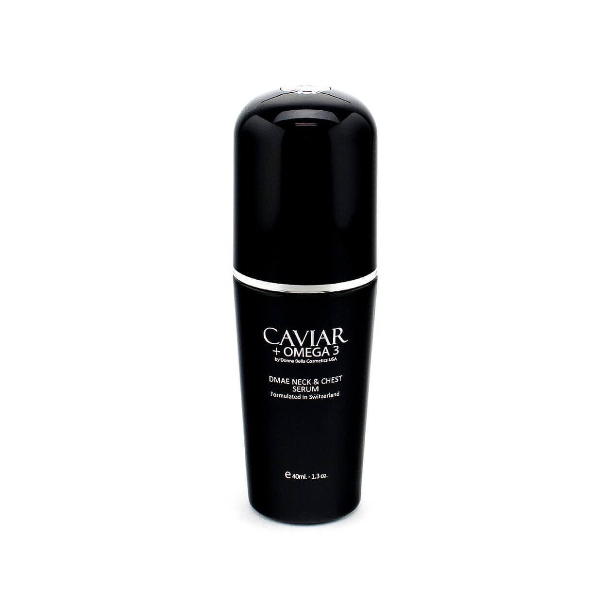 Donna Bella’s Caviar + Omega 3 DMAE Neck & Chest Serum is formulated to repair damaged skin, reduce inflammation and improve tone and elasticity. The active ingredient DMAE brightens skin, improves the effects of other antioxidant ingredients and reduced sagging. Continued use reduces the accumulation of discoloring skin pigments and reduces free-radicals in the skin, resulting in a rapid improvement in the skin’s firmness.