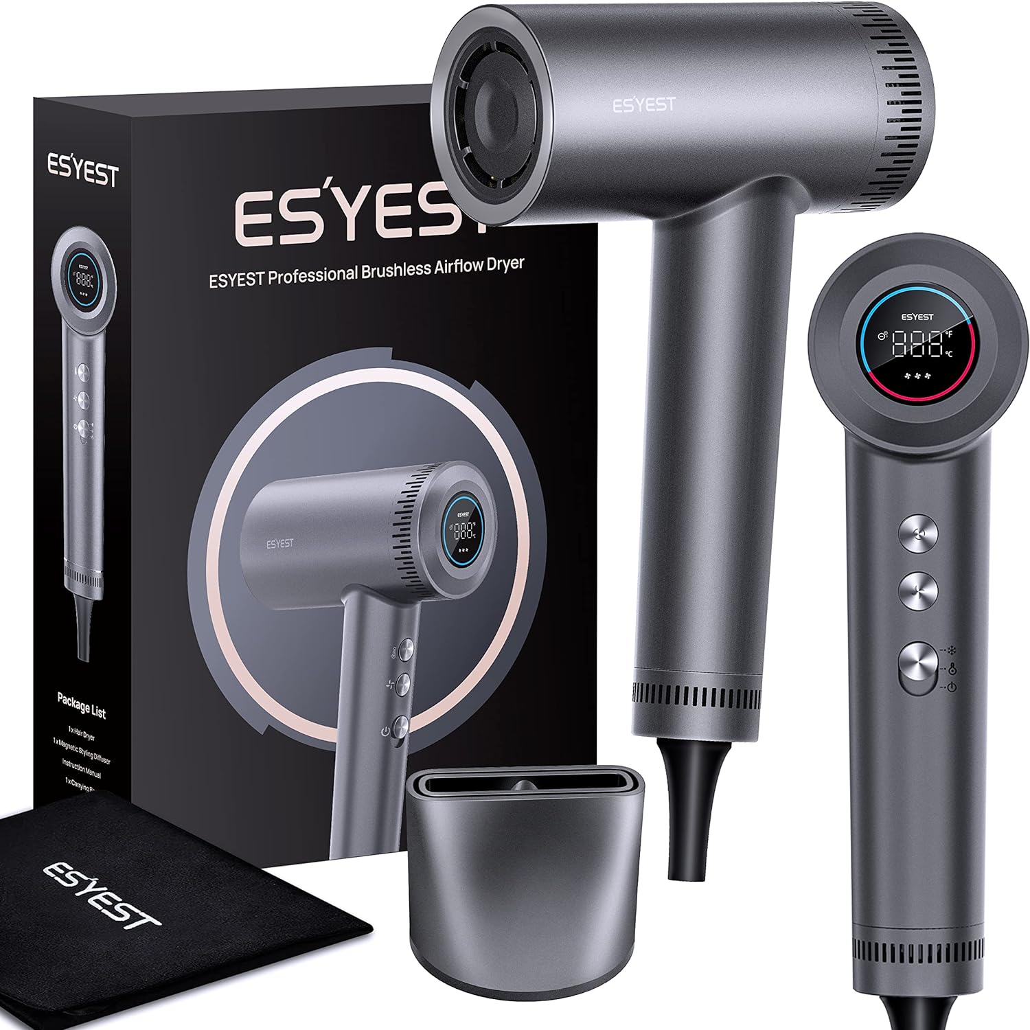 【HighSpeed Hair Dryer】- The ESYEST High-Speed hair dryer features a 1,500W powerful 102000RPM Brushless Motor for ultra-fast drying.You can efficiently style your hair in a short time and you can last your styles.with air being propelled at 13 liters per second and wind speeds up to 20 meters per second, almost about 12 wind levels,It is 3x faster than traditional hairdryer.Motor lasts 2000hrs, which is 17 years of service life.